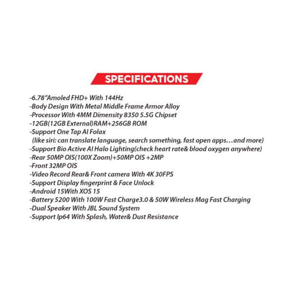 Long-Lasting Battery & Premium Build with 5200mAh capacity, 100W fast charging, 50W wireless charging, metal Armor Alloy frame, dual JBL speakers, Android 15, and IP64 water/dust resistance.