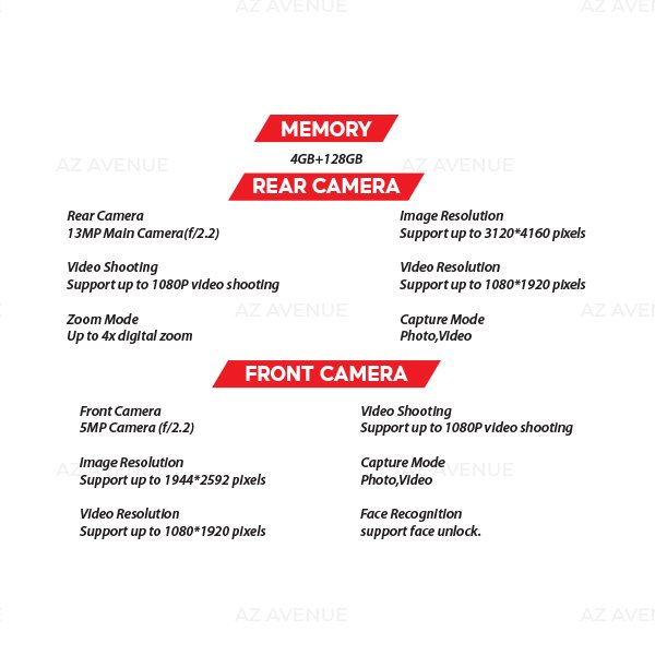 - 13MP main camera captures crisp details and true colors for vivid everyday photos.