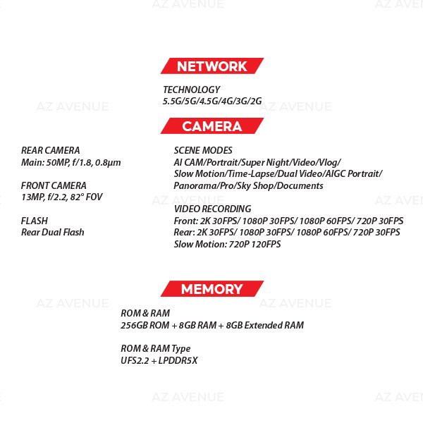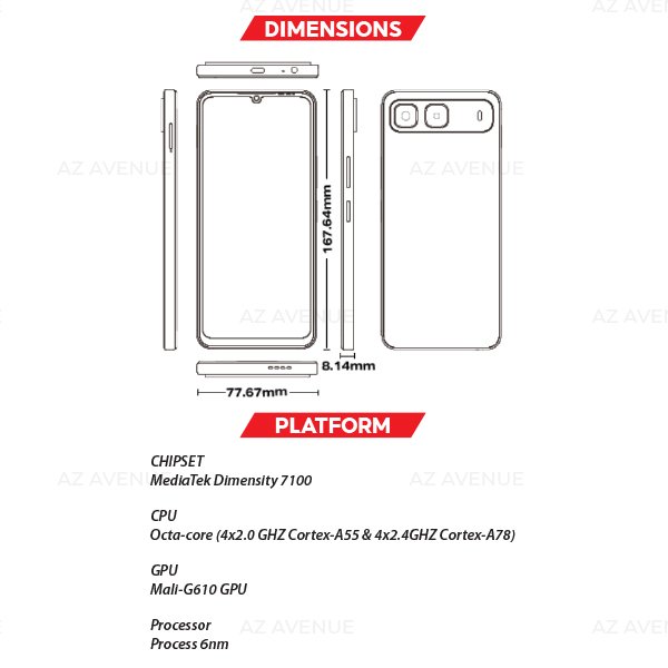 - MediaTek Dimensity 7100 5G Chipset: High-performance 6nm octa-core processor with clock speeds up to 2.4GHz, delivering efficient 5.5G/5G connectivity.