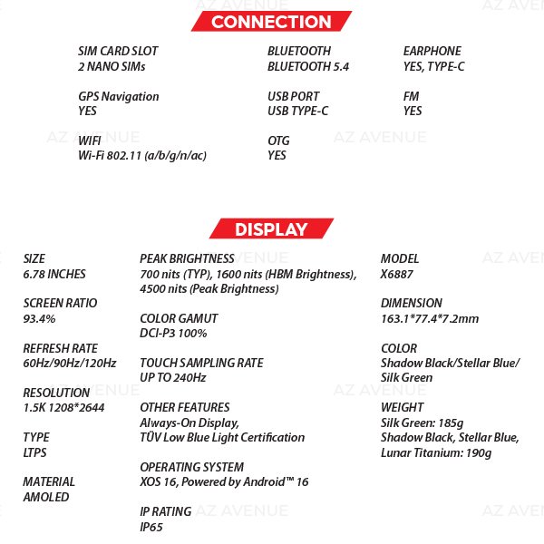- Next-Gen XOS 16 System: Optimized user experience powered by Android™ 16, featuring an in-display fingerprint sensor and Infrared Blaster.