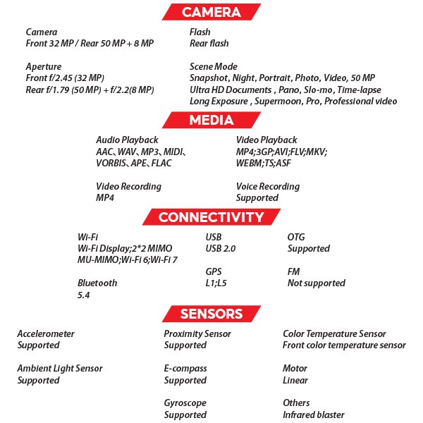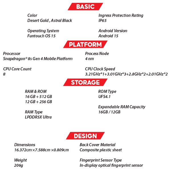 • Snapdragon 8s Gen 4 with “1 Super Core + 7 Large Cores” for high performance and power efficiency