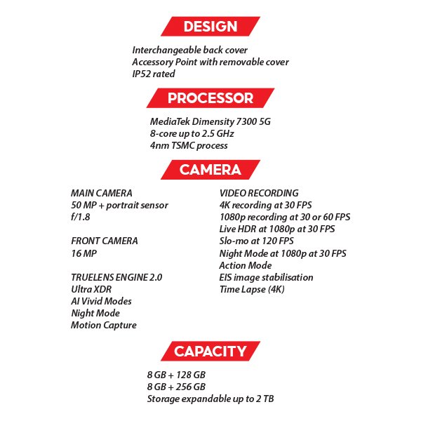 - MediaTek Dimensity 7300 5G Processor: Built with TSMC’s 4 nm process technology, offering advanced power efficiency for long-lasting performance.