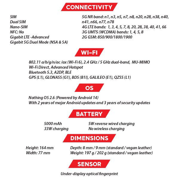 - Nothing OS 2.6: Experience an optimized Android 14 interface with fast, smooth performance. Includes 2 years of major updates and 3 years of security updates.