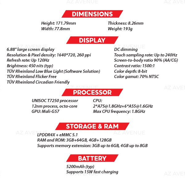 • The large 6.88-inch display with 120Hz refresh rate and 240Hz touch sampling rate delivers fluid visuals and an engaging viewing experience. A resolution of 1640×720 and a 90% screen-to-body ratio ensure vivid and expansive content. The screen supports wet-touch operation and has triple TÜV Rheinland certifications for eye safety: Low Blue Light, Flicker Free, and Circadian Friendly.
