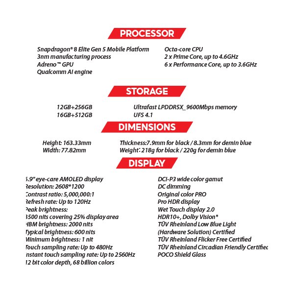 • POCO HyperRGB Display: Full RGB subpixel structure, 68 billion colours, 100% DCI-P3 gamut, 120Hz refresh rate, and 2560Hz touch sampling rate.
