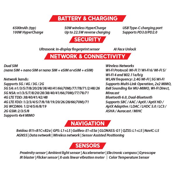 • Fast Charging: 100W wired HyperCharge reaches full charge in 38 minutes; 50W wireless HyperCharge charges to 50% in 31 minutes.