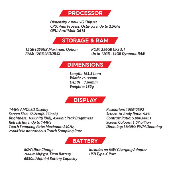 - Dimensity 7300+ 5G chipset supports smooth multitasking and fast gaming.