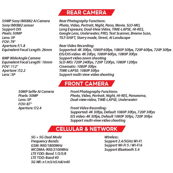 - 50MP Sony IMX882 AI camera captures detailed images.