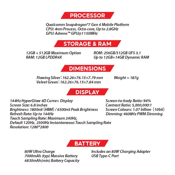 - Battery & Charging: Massive ~7000 mAh battery — among the biggest in its class — giving very long battery life. Supports 80 W fast charging (so you can get back to good battery quickly).