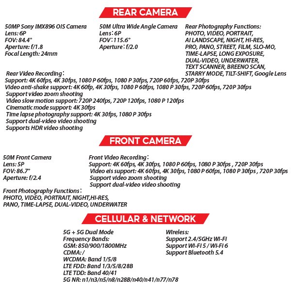 - Cameras: Triple-50 MP camera setup: main 50 MP with OIS (optical image stabilization), 50 MP ultrawide, plus 50 MP front camera for selfies/video. Rear camera supports 4K video, various shooting modes (night, portrait, panorama, slow-mo, etc.).