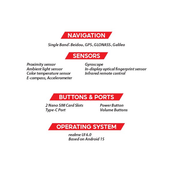 - Software & Connectivity: Runs on Android 15 with realme UI 6.0. Supports 5G, dual-SIM, Wi-Fi (incl. modern standards), Bluetooth, and standard sensors including in-display fingerprint.