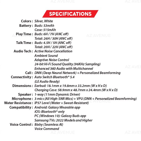 - Galaxy AI Adjusts Sound to Your Fit: Delve into your personal soundscape with Galaxy AI-assisted Adaptive EQ and ANC. The AI-boosted algorithm analyzes sound detected through the inner and outer mics in real-time and optimizes your listening experience by adjusting the sound to your fit.