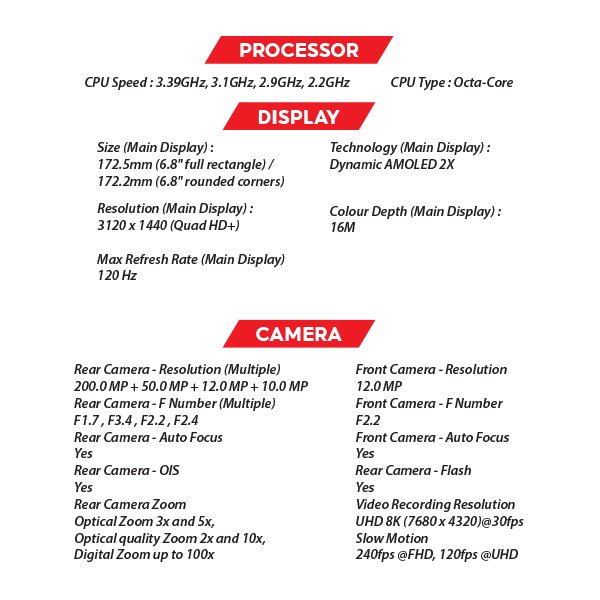 - 200MP Camera: Capture stunning details with the highest megapixel count on a smartphone, enhanced by AI processing. The ProVisual Engine improves color tone, reduces noise, and enhances detail recognition.