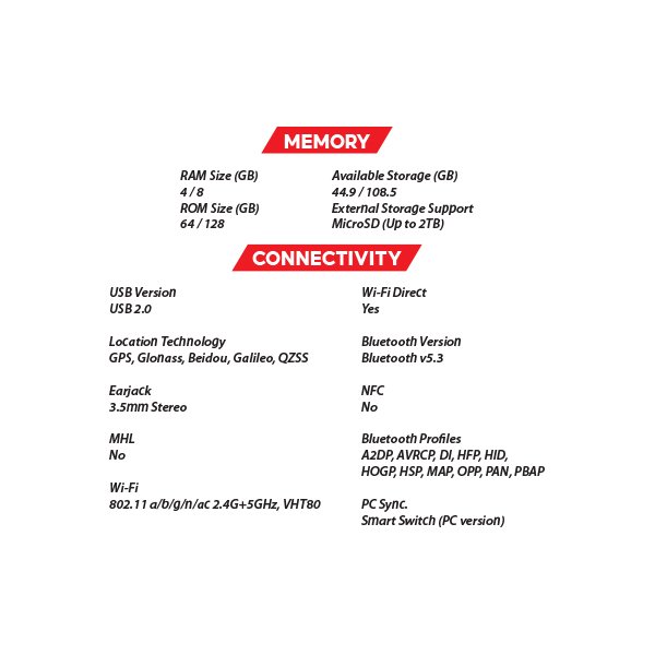 - With up to 4 or 8 GB of memory and 64 or 128 GB of built-in storage, the Galaxy Tab A11 allows for fast multitasking and ample space for your files, apps, and media. Additionally, you can expand the storage by up to 2 TB using a microSD card, ensuring you have more than enough room for your content.