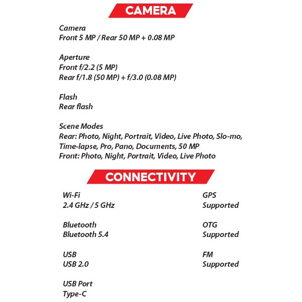 • Dimensity 6300 5G Processor: Efficient 6nm octa-core chipset delivering reliable 5G performance and smooth daily operations.