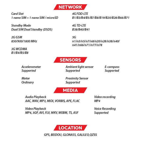 • Comprehensive 5G Connectivity: Supports a wide range of 5G NR bands for high-speed internet and Dual SIM Dual Standby functionality.