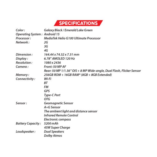 MediaTek Helio G100 processor, 11-layer cooling system, IP68/IP69 dust and water resistance, and optimized gaming performance with ultra-low latency.