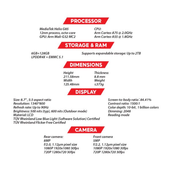 Lightweight and travel-ready with an 8.7” eye-friendly 90Hz display. Powered by a Helio G85 processor, up to 6GB RAM, and 128GB storage (expandable to 2TB). Offers a 6650mAh battery for all-day use with 18W fast charging. Enjoy immersive audio with Dolby Atmos®, dual cameras, and a 3.5mm jack. Perfect for entertainment and productivity on the go.